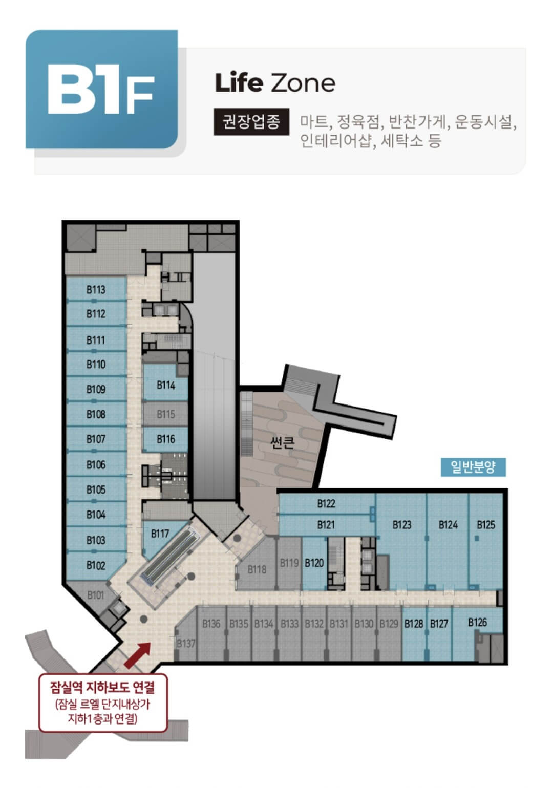 잠실역 연결 통로를 활용한 지하 1층에는 빠른 회전율을 기대할 수 있는 생활 밀착형 업종을, 가시성이 뛰어난 지상층에는 코너 상가의 장점을 극대화할 수 있는 프랜차이즈나 F&B 업종을 배치했고, 상층부에는 단지 내 상가의 특성을 고려한 병의원, 학원 등을 유치하여 안정적인 고객층을 확보했습니다.